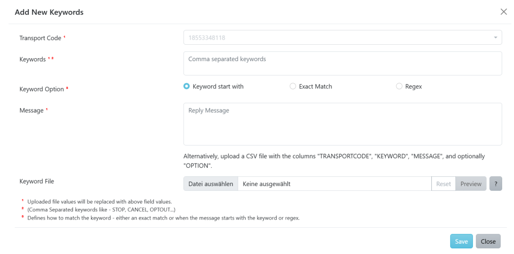 | 01 | Transportcode | Yes | 4 – 15-digit number | Your sender ID (e.g. the short code or longcode for which you are configuring your replies |