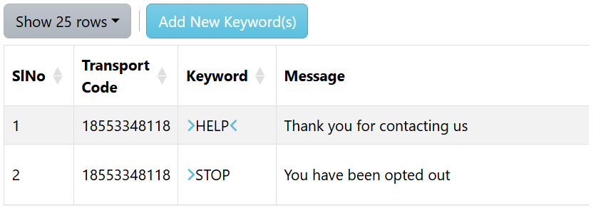 In this configuration, messages containing only the keyword HELP trigger the help response, messages prefixed with STOP trigger the opt-out response, and all other inbound messages return the default “not monitored” reply..