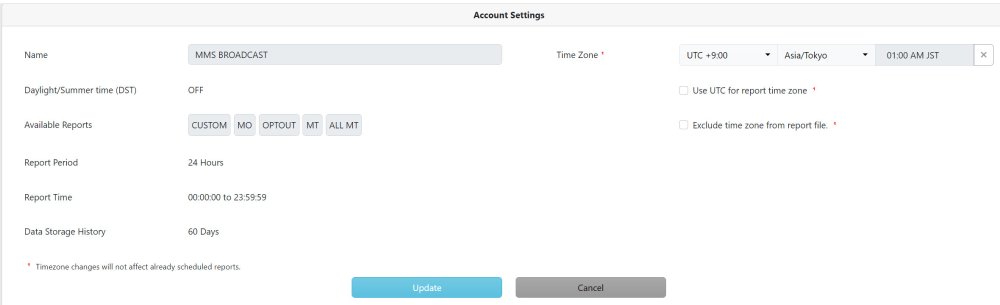 For scheduling broadcasts and reporting periods, the system time zone can be set from this screen. Select a time zone from the drop down and click update to make this change. Most other parameter are configured based on your account and provide you a overview of your product configuration. Please contact your account manager if you require optional features.