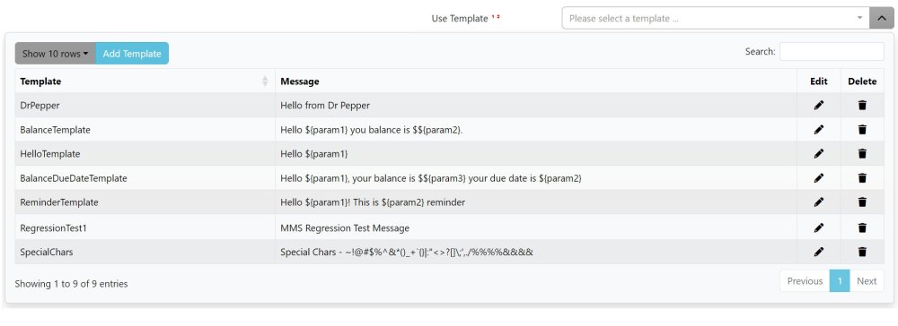 Templates are created by the user and allow for message content to be stored for future broadcasts. Templates may include any number of parameters that are populated from the uploaded CSV broadcast file (e.g. first name, last name, balance, appointment date, etc.). Templates can be added, deleted, or modified by the user.